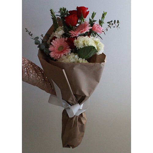 All of our favorite flowers in one bunch! The Beautiful Wrapped Bouquet is a fresh mix of roses and Gerber daisies wrapped in brown kraft paper for a clean look. This beautiful arrangement is lovely, bright, and oh-so perfect for your Valentine!