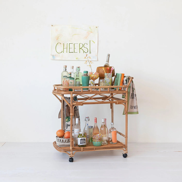 This rattan 2-tier bar cart on wheels is a wonderful addition to any home that loves a rustic and natural vibe. It is hand-woven from high-quality rattan that has a beautiful texture and color. The bar cart has a natural finish that enhances its organic appeal. The bar cart has two rectangular shelves that offer ample space for storing and serving beverages, appetizers, or decorative items.
