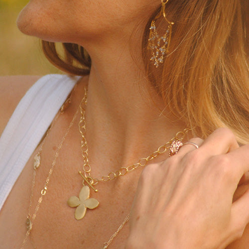 An original and favorite! A classic hand-sculpted dogwood bloom with a gold-filled oval chain. Just like its namesake this piece looks like a flower and a cross. A simple, but bold and classic look that can be worn every day. The toggle closure adds to the over all appeal and ease.