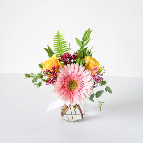 This Flower Gift Box + Signature Candle is a forever favorite and a wonderful gift for Birthdays, Thank you, or Thinking of You gifts. This gift set includes a small arrangement, featuring a colorful gerber daisy, 2 roses, and a mix of filler greenery. Also includes one of our Sophie's Signature candles! Pick from favorites like Napa, Cashmere, Orange Rind, and more. The flowers and candle are presented in a box with tissue paper and a handwritten card (include your message at checkout)! A perfect gift for many occasions...they'll love this sweet gift!