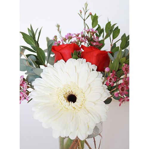 - A fresh, mini vase arrangement of flowers includes a sweet Gerber daisy along with fresh roses and a mix of beautiful greenery. The arrangement measures approximately 10" tall from bottom of vase to the top of arrangement.