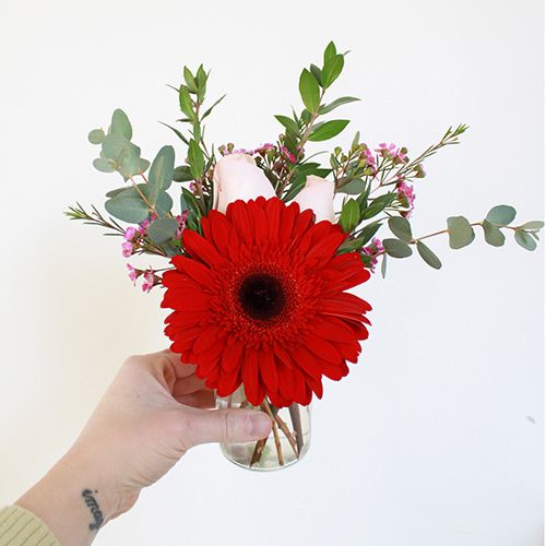 - A fresh, mini vase arrangement of flowers includes a sweet Red Gerber daisy along with fresh roses and a mix of beautiful greenery. The arrangement measures approximately 10" tall from bottom of vase to the top of arrangement.