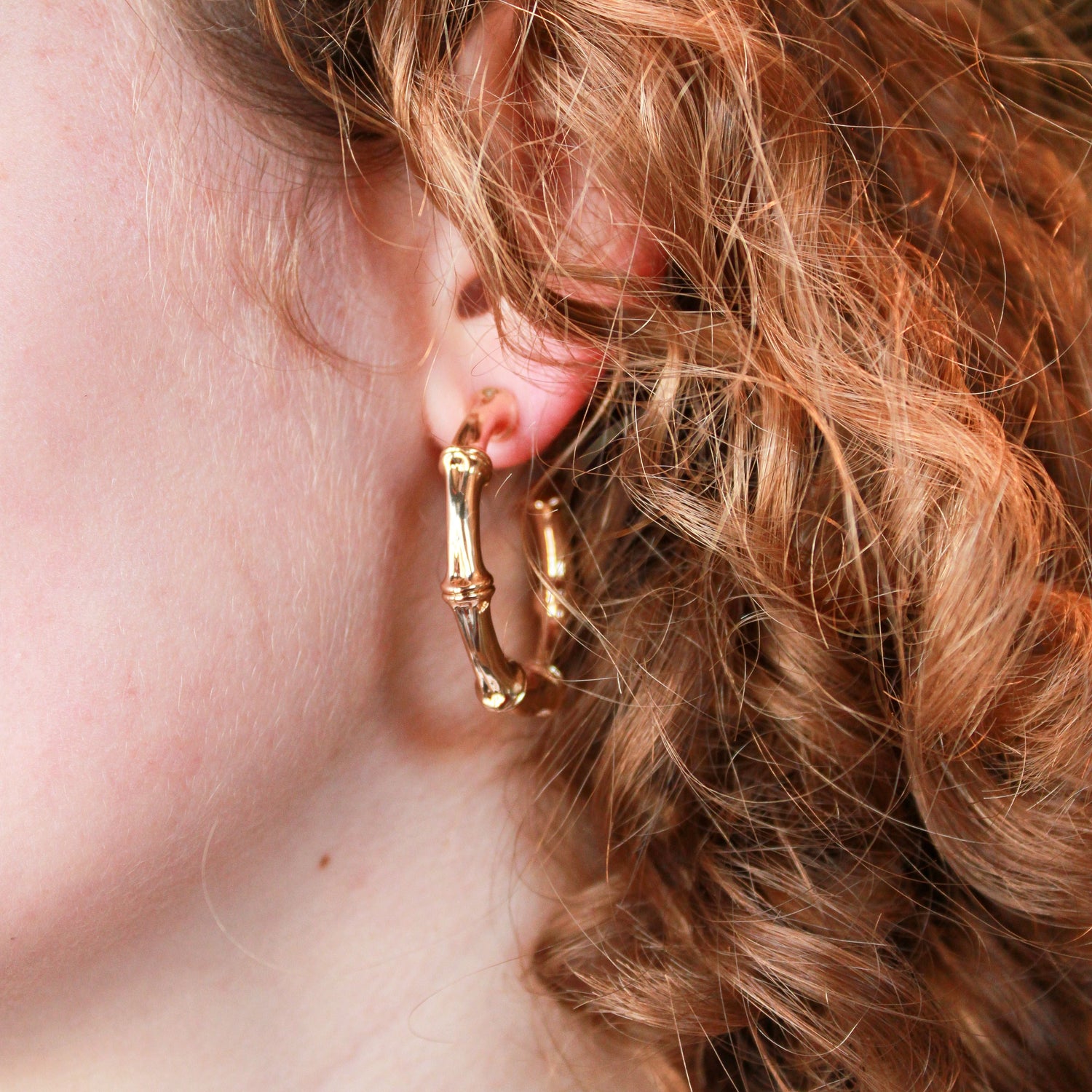 Elevate your accessory game with the Golden Thick Bamboo Hoop earrings, crafted from durable zinc metal casting for a medium-weight feel. Their bold bamboo-inspired design adds a stylish edge, making them the perfect statement piece to enhance any outfit with lasting comfort and sophistication.