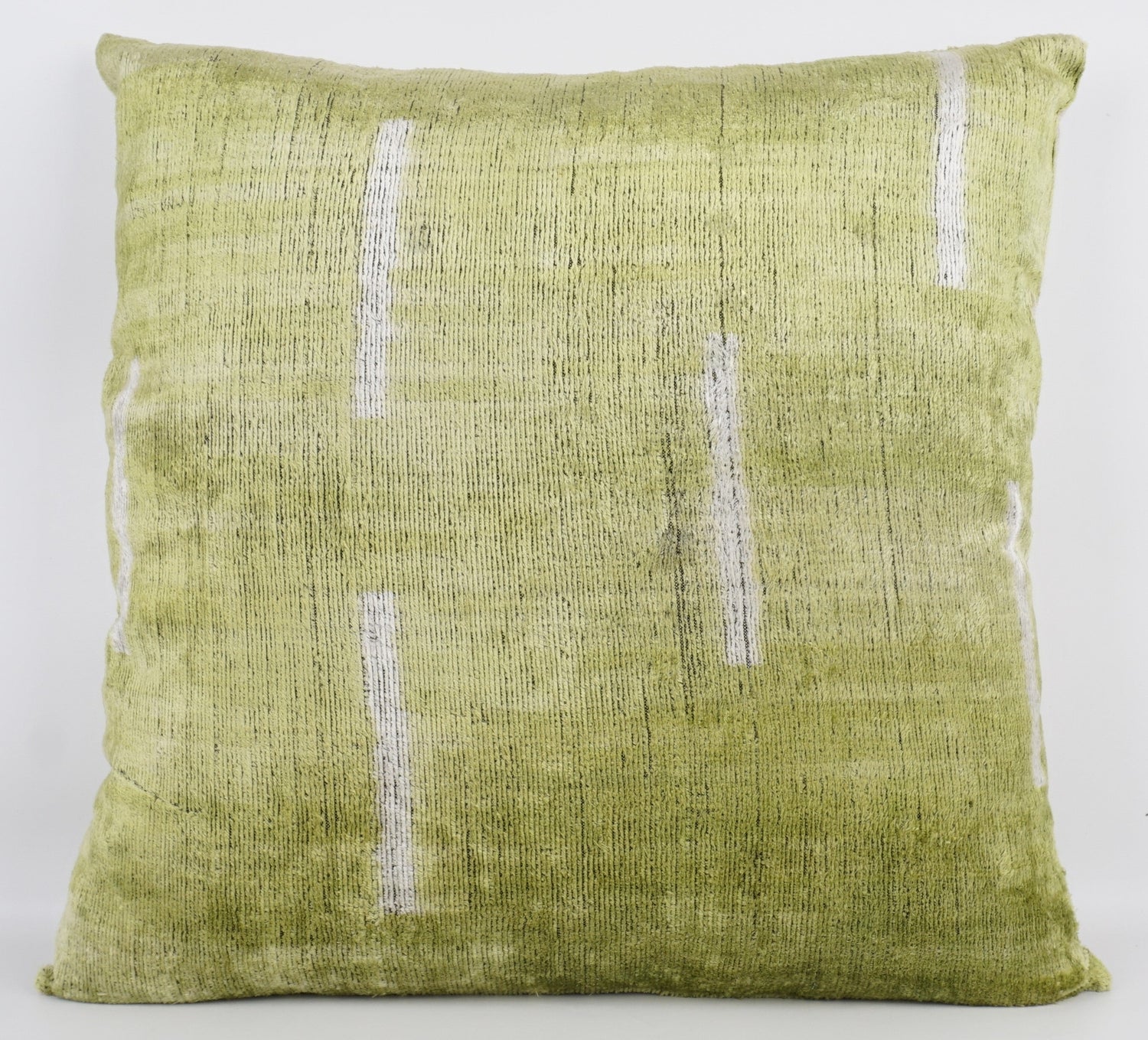 This handwoven pillow combines the rich textures of ikat silk and velvet in soothing green and white tones. Its artisanal craftsmanship adds a unique, elegant touch to any living space, while the soft materials provide comfort and style. Perfect for enhancing your home’s cozy atmosphere with a subtle yet distinctive accent.