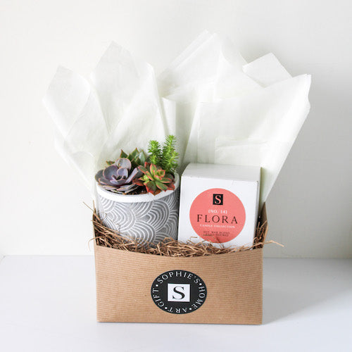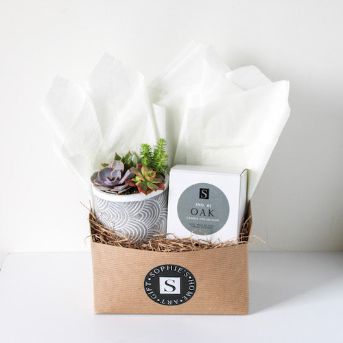 The Grey Patterned + Signature Candle Gift Box is a shoppe favorite! This gift box features an assortment of succulents in a grey and white cement pot, along with one of our Sophie's Signature candles. Perfect gift for any occasion - birthdays, Mother's Day, showing appreciation, and more!