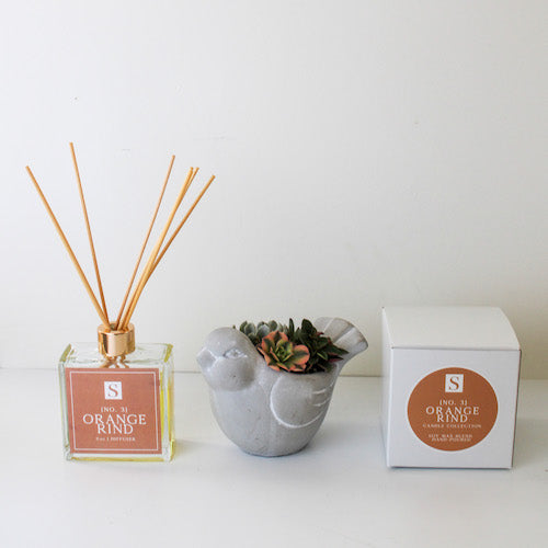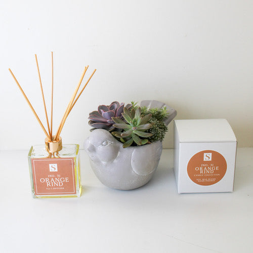 The Luxe Orange Rind + Bird Succulent Gift Box features our bird succulent, candle & diffuser trio! This gift box features an assortment of succulents in an adorable gray cement pot, along with one of our Sophie's Signature candle + Sophie’s Signature diffuser. Perfect gift for any occasion - birthdays, Mother's Day, showing appreciation, etc - offering that little extra touch to show you care.