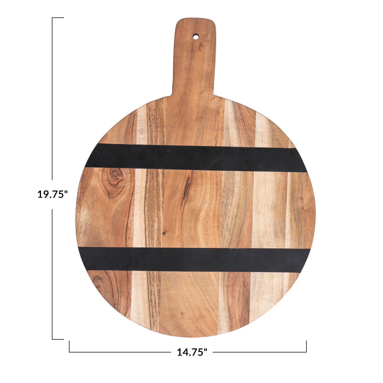 This natural and black mango wood cheese and cutting board is a practical and elegant way to serve snacks. It features a natural mango wood finish and black stripes, adding a touch of elegance to the space. Made from sustainable mango wood, it has a smooth, grainy texture and a round shape, with a handle for easy carrying and storing.