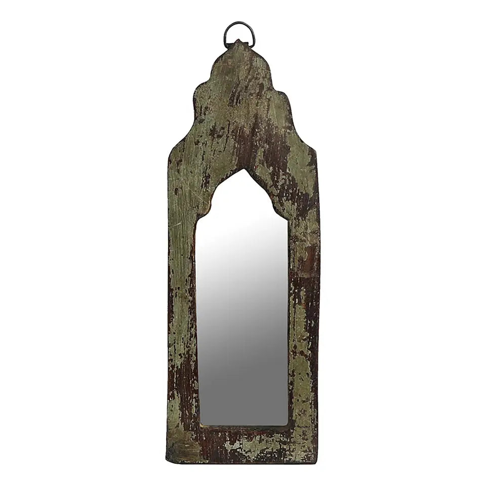 A handcrafted reinterpretation of a vintage design, we’ve hand-chosen recycled siding from village homes across India and repurposed it into frames for a rustic accessory. Paint and patina are original on each mirror. This is a vintage item.