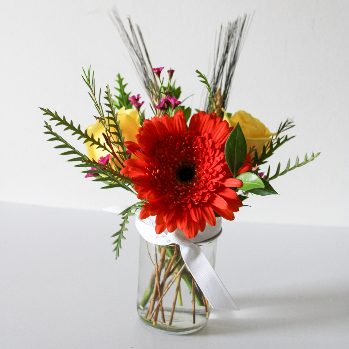 - A fresh, mini vase arrangement of flowers includes a sweet Gerber daisy along with fresh roses and a mix of beautiful greenery. The arrangement measures approximately 10" tall from bottom of vase to the top of arrangement.
