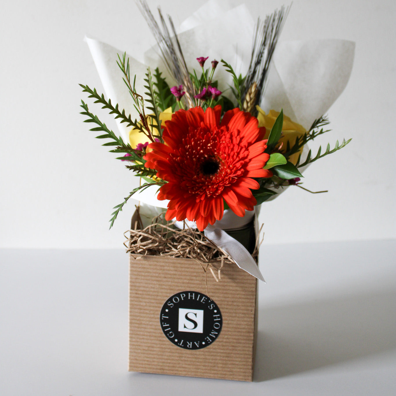 A favorite fresh flower arrangement perfect for a friend or thank you. Perfectly boxed and ready to give. Our absolute most popular gift. We have been making our mini vase flower arrangement since day one of opening the shop....and 20 years later, it is still a shoppe favorite!