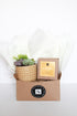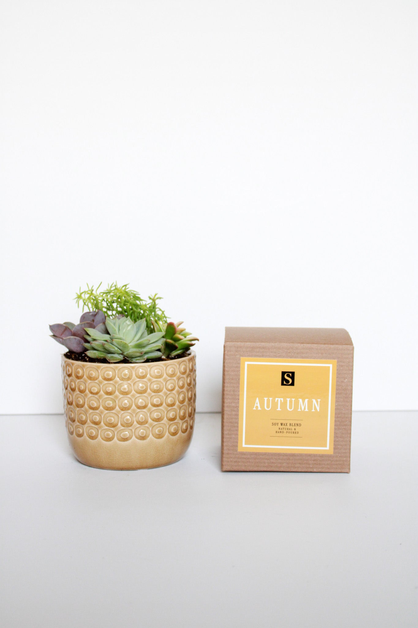 Candle Gift Box. This delightful box includes a charming succulent in a mustard circle pot, a hand-poured fall scented candle and a unique ceramic planter. Perfect for gifting or treating yourself to a touch of seasonal luxury.