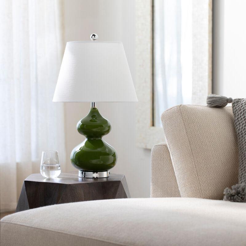 Illuminate your space with the stunning Olive Lamp. Made of hand-painted green glass, this lamp adds a touch of elegance and color to any room. Combined with its beige linen shade, it creates a warm and inviting ambiance. Inspire your senses with this beautiful and unique lighting piece.