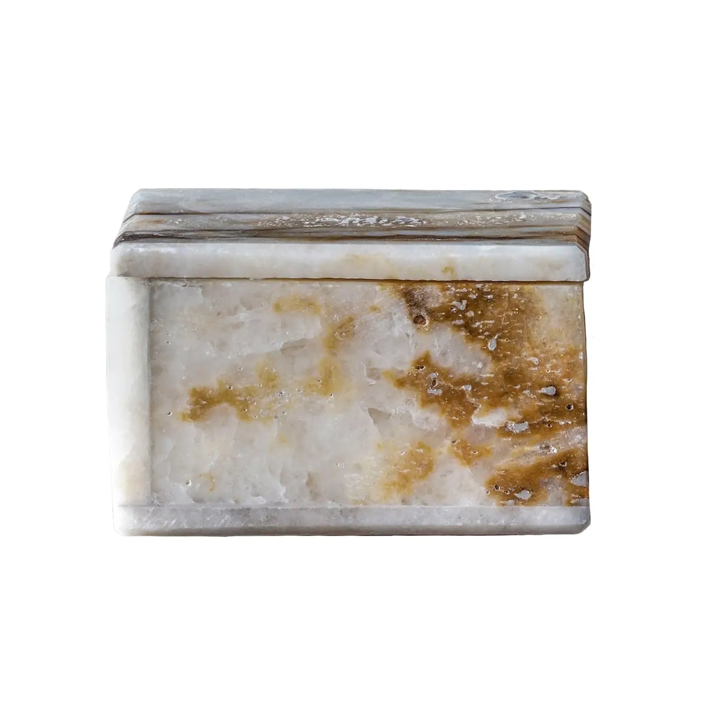 It is easy to mistake the Onyx Box for marble, except the coloration is a bit more nuanced. Crafted from brown onyx, which is plush with white and tawny brown banding, the Onyx Box is an attractive storage accent. Each piece is unique based on the stone's natural colorations.