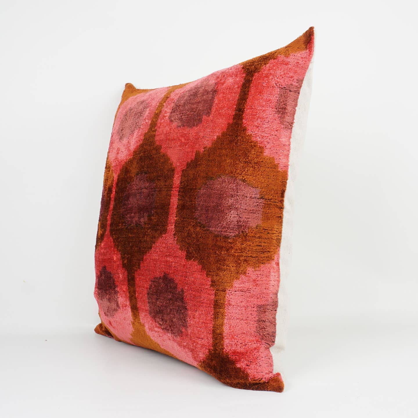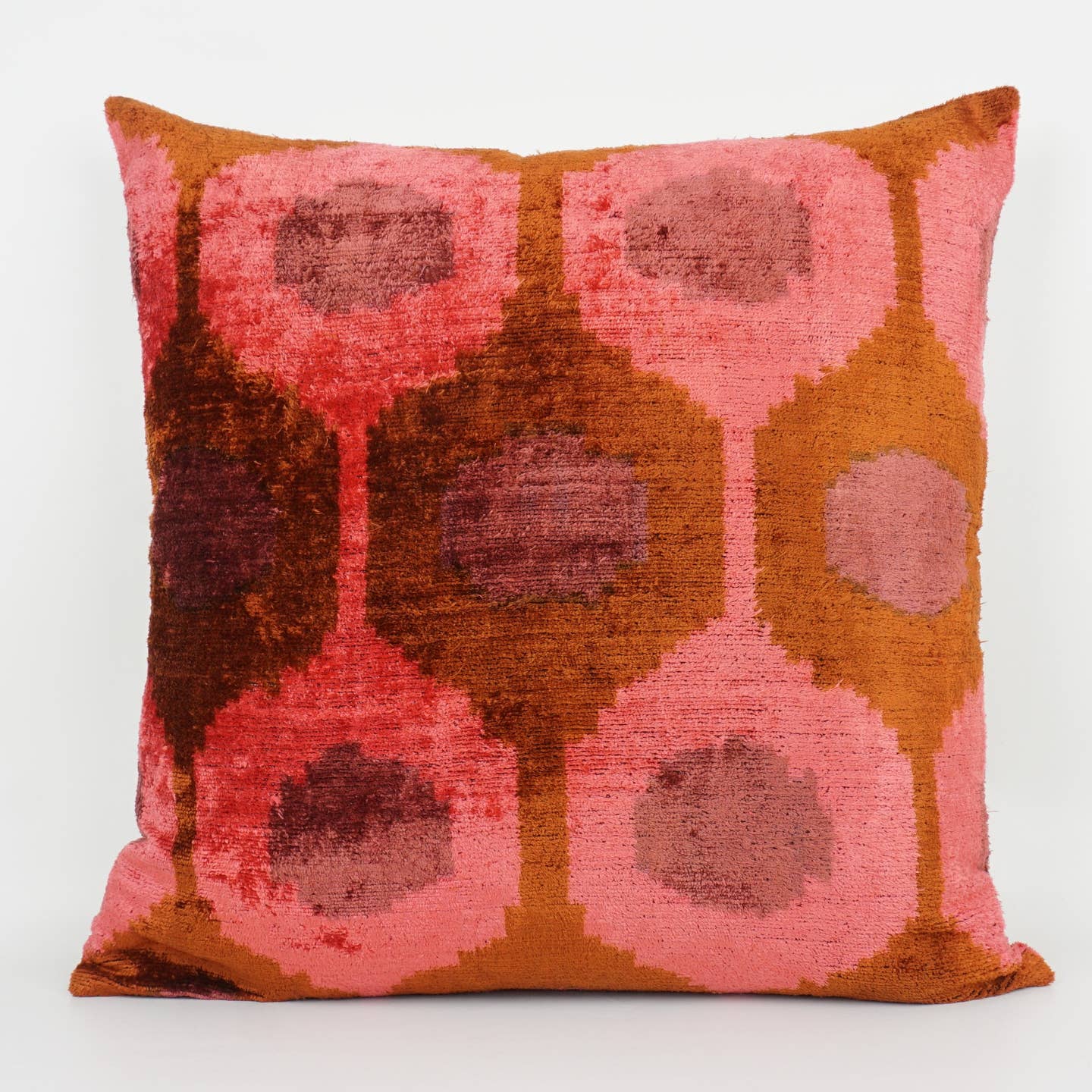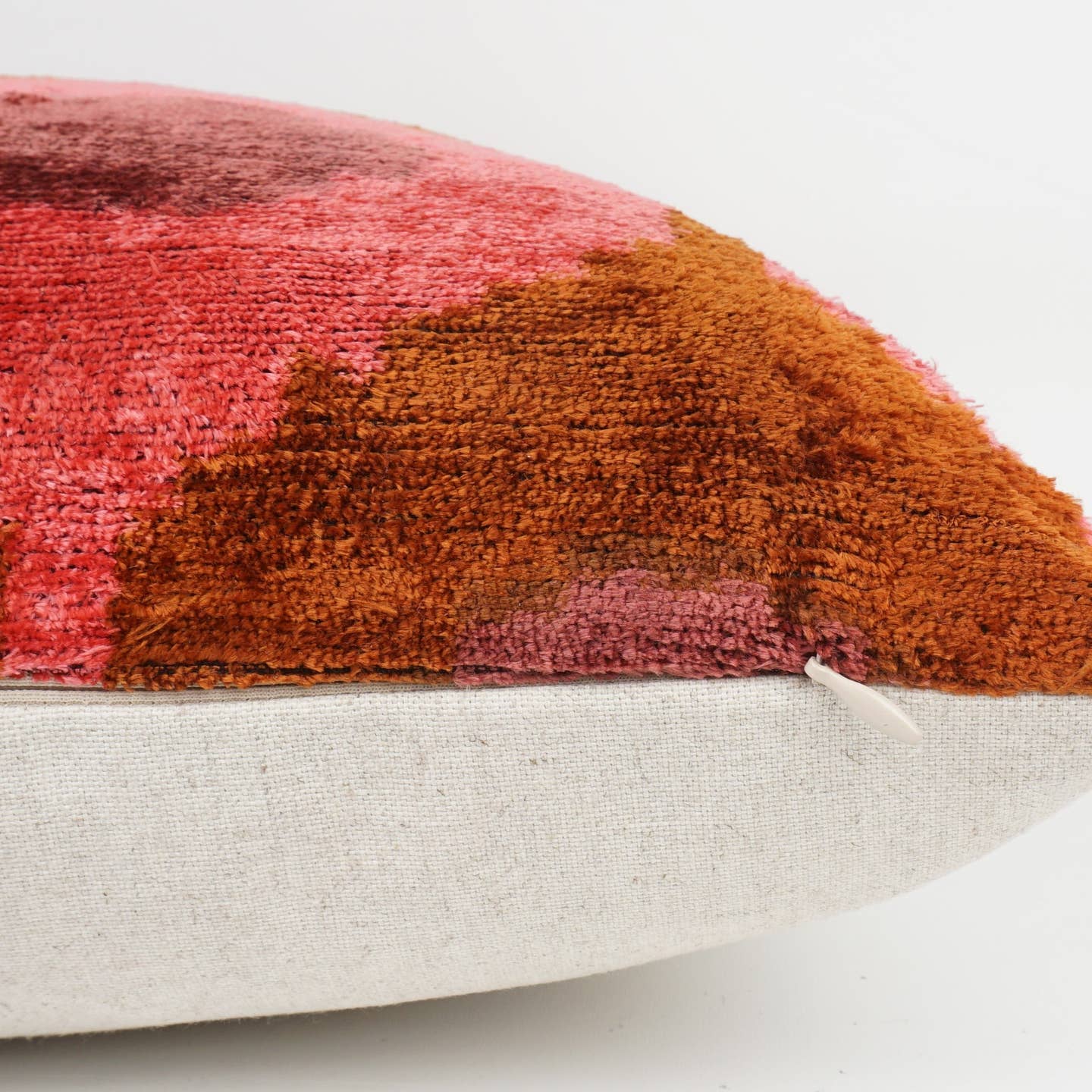Elevate your home decor with this stunning pink and orange geometric handwoven pillow, crafted from luxurious ikat silk and plush velvet. Its unique blend of rich colors and textures adds warmth and sophistication to any room. Experience the perfect combination of artisanal craftsmanship and comfort—an irresistible accent that transforms your space effortlessly.