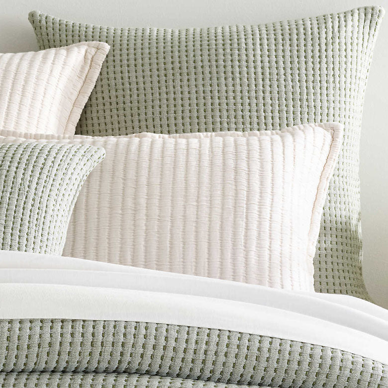 Precisely crafted pick-stitch accentuates the yarn dyed cotton jacquard of this reversible matelassé coverlet and matching sham. The double layer delivers lightweight warmth and a soft hand. Reverses to a solid back. Crafted by artisans committed to fair-labor practices.