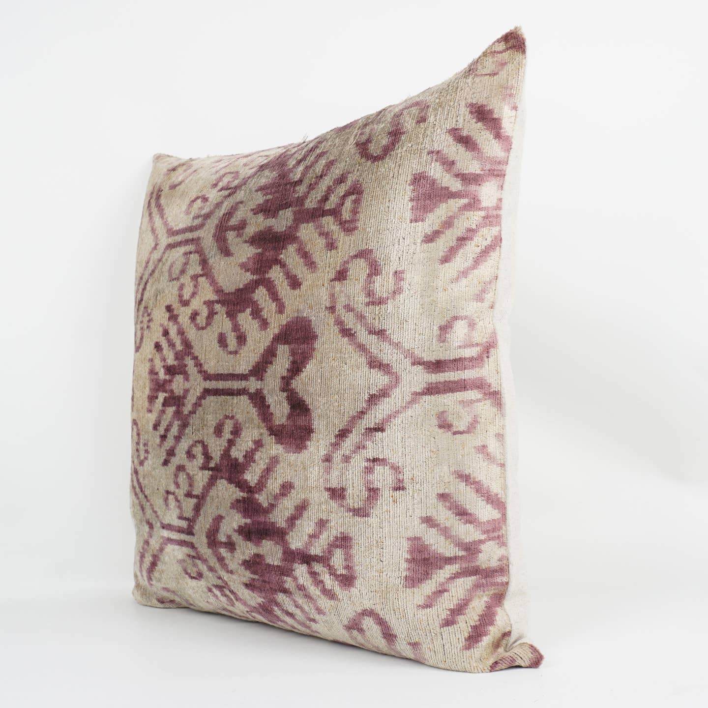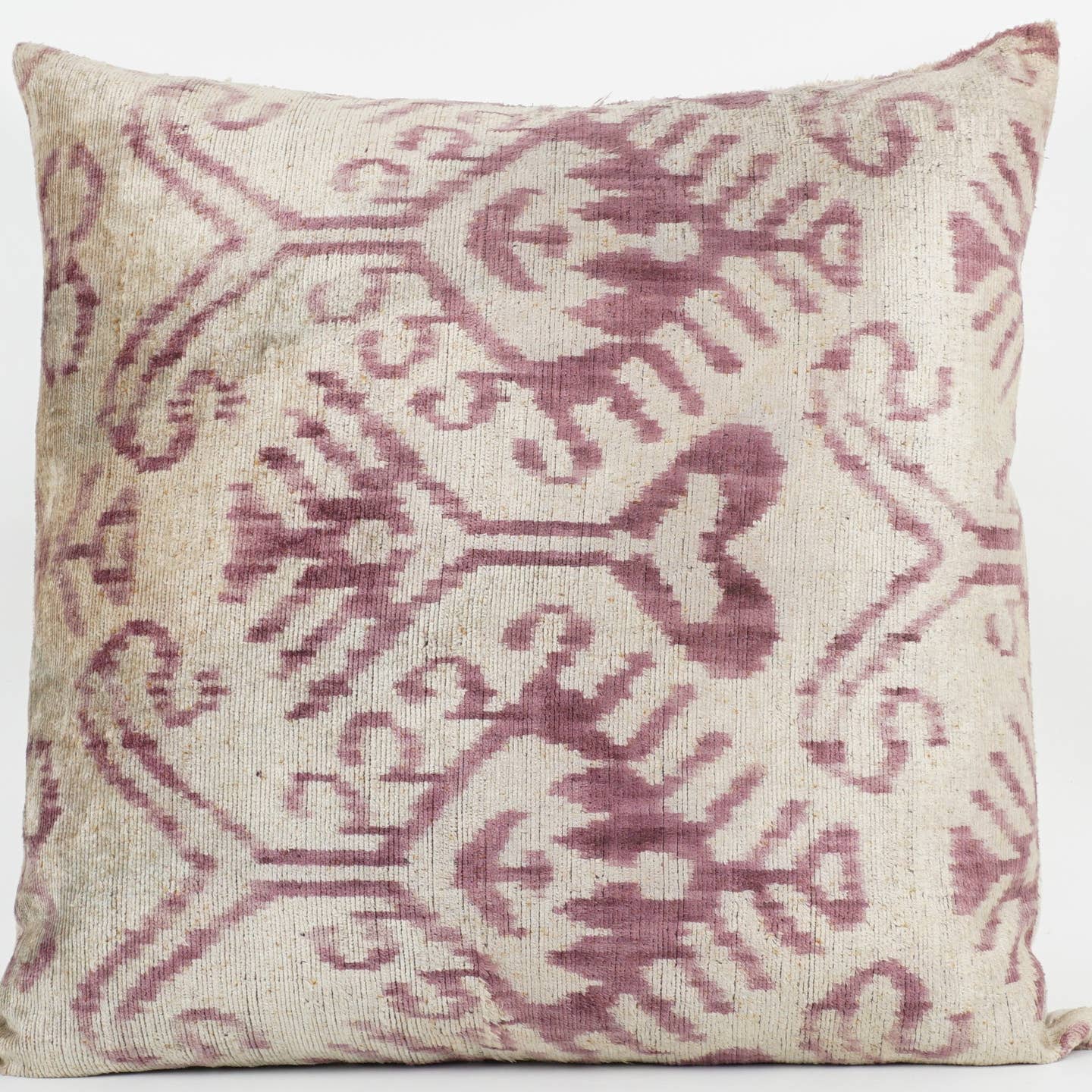 Elevate your home decor with this stunning pink and white handwoven pillow, crafted from luxurious ikat silk and plush velvet. Its unique blend of rich colors and textures adds warmth and sophistication to any room. Experience the perfect combination of artisanal craftsmanship and comfort—an irresistible accent that transforms your space effortlessly.