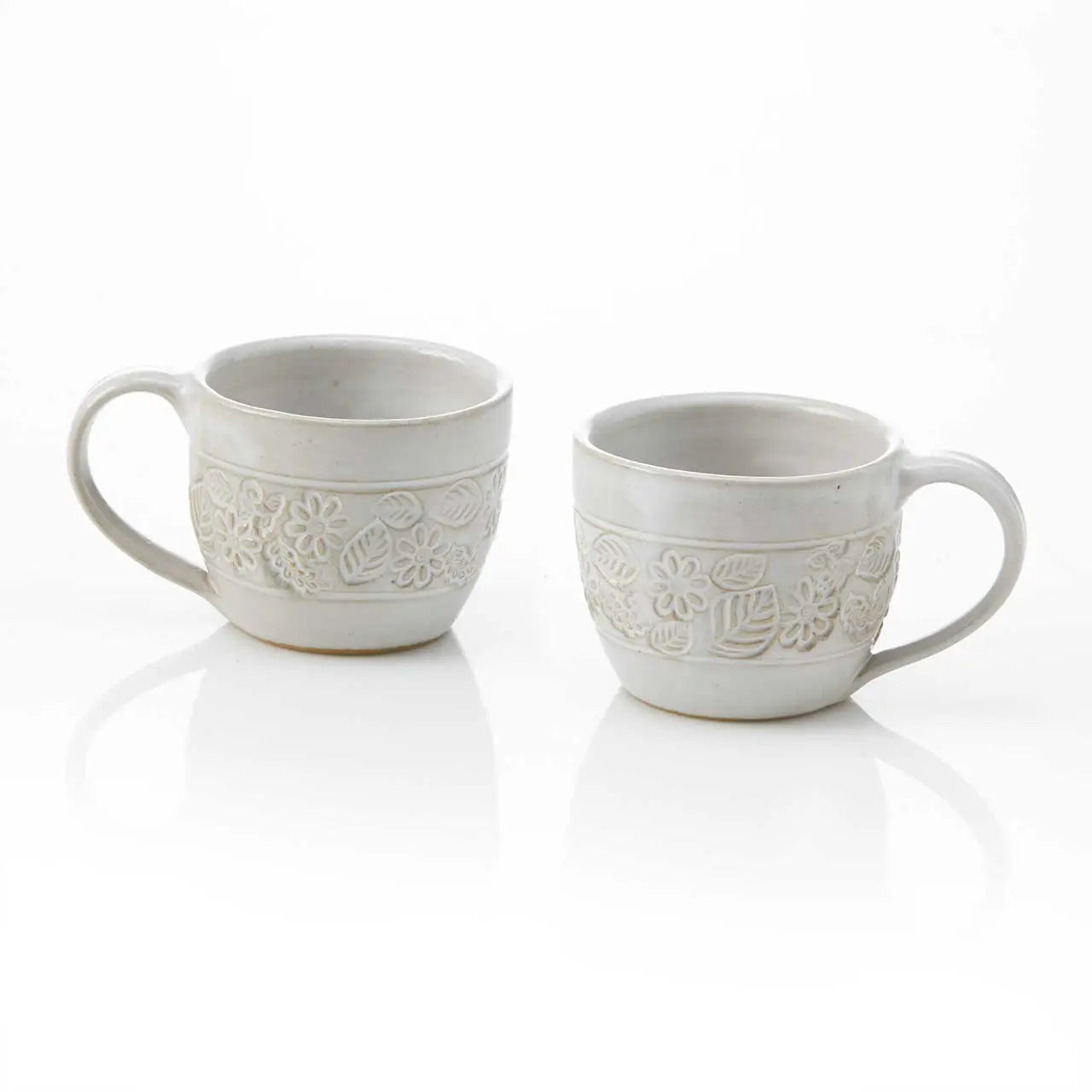 You'll love these adorable fair trade coffee cups! Each handmade ceramic mug is ethically crafted from natural stoneware clay, which is shaped and embossed with a lovely floral design, all by hand. Perfect for lattes, teas, hot chocolate and more, you'll find these versatile and sustainably made coffee mugs a must for your morning routine. Finished with a cream-colored glaze.