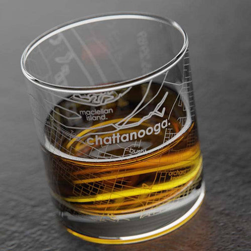 These etched map rocks glasses shows details of the city of Chattanooga, including coordinates and key areas. They are great for sipping spirits.