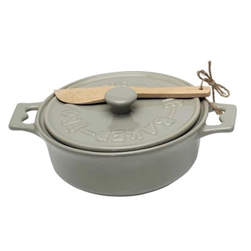 So adorable & so useful! This Grey Brie Baker dish is perfect for cooking dips, cheese, cobblers, and more. Includes a wooden spatula for spreading your delicious creation. Serve up appetizers in style!