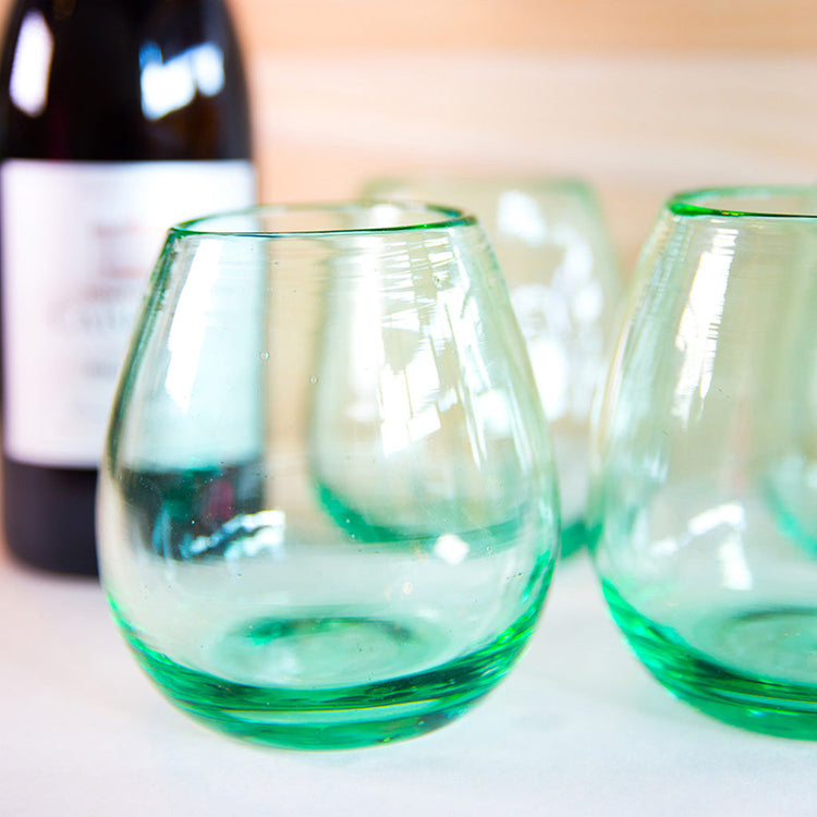 Beautiful recycled stemless wine glass. Handmade and perfect for entertaining. Each stemless glass is one of a kind and each one varies.