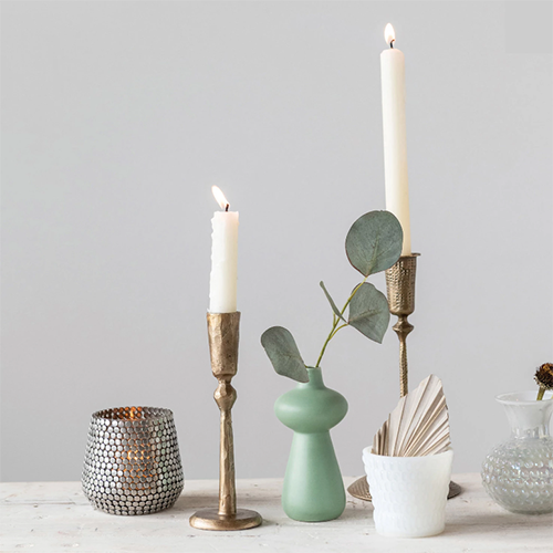 Stylishly designed, this hand-forged, metal taper candle holder has an antique brass finish. An imperfect texture gives it a unique appearance. Display with similar complementary pieces or as a stand-alone piece.