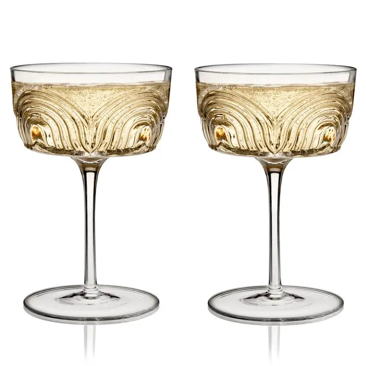 Featuring an angled bowl, classic stem, and sweeping textured arches, these crystal cocktail coupes are inspired by the delicacy and detail of the Art Deco era. Add some 1920s style to your Martinis, Champagne, or Manhattans with this cocktail glassware set.
