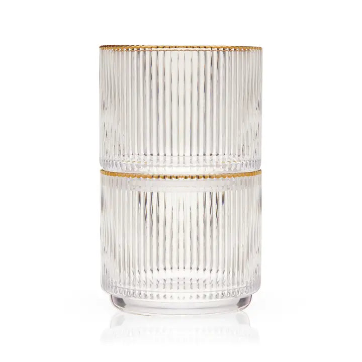 With stunning clarity and a rippled texture, this pair of stackable gold-rimmed tumblers are ideal for spirits on the rocks or lowball cocktails. The weighted base and rounded silhouette give each glass unique elegance that enhances your home bar or glassware collection.