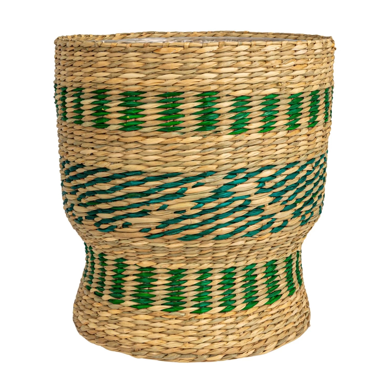 This set of Seagrass Baskets with Plastic Lining is a perfect addition to any home seeking a blend of functionality and aesthetic appeal. The larger basket measures 11 inches in diameter and stands 9.75 inches tall, while its companion is 9.75 inches in diameter and 9 inches tall. Their robust construction and plastic lining make them suitable for a variety of uses, from holding bathroom essentials to corralling kitchen gadgets. The green accents woven into the natural seagrass offer a pop of color that complements an array of interior styles, from the laid-back boho to the more structured rustic and transitional themes. Whether used together or separately, these baskets are sure to bring organization and style to the living space.