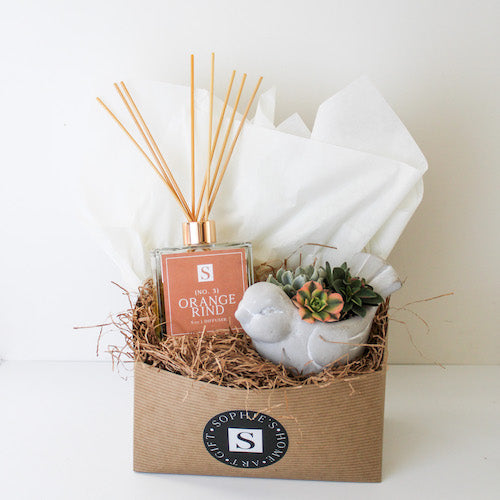 The Small Bird Succulent + Napa Diffuser Gift Box is a duo favorite! This gift box features our sweet, cement bird with a mix of succulents and a signature Orange Rind diffuser. This gift box is simple, yet sweet, and makes for the perfect gift.