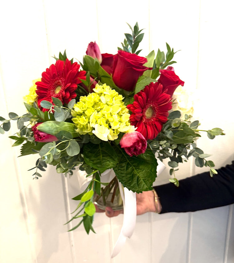 Our Lovely Arrangement features a lush bouquet of full white hydrangeas, red tulips, red roses, red gerbers and beautiful greenery. They're sure to love this beautiful gift!