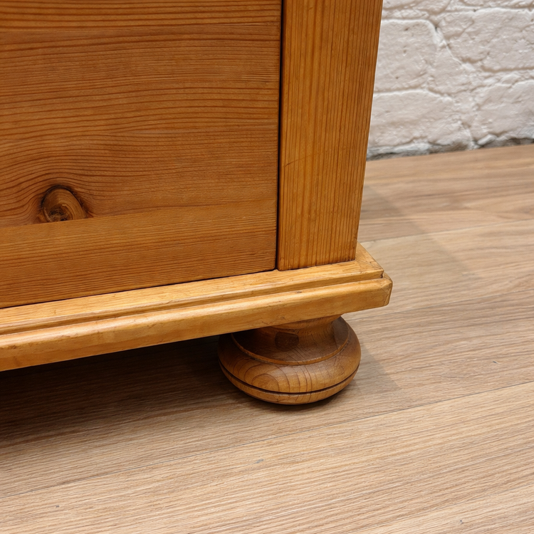 This vintage pine chest of drawers is a beautifully crafted storage piece with timeless appeal and classic detailing. Made from solid pine, it features four spacious drawers accented with traditional brass pulls, turned column details at the corners, and a softly aged finish that highlights the natural wood grain. The top drawer showcases subtle carved detailing, adding depth and character.
