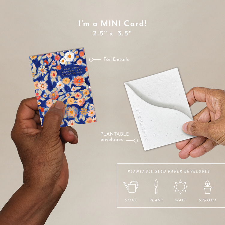 Meet the newest little sprout! Think all the goodness of our full size greeting card but at a petite "mini me" and super cute enclosure card size. All Seedlings sprouts have foil details and a plantable seed paper envelope which is embedded with wildflower seeds.