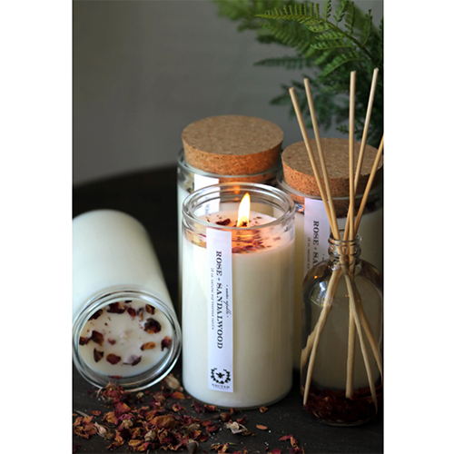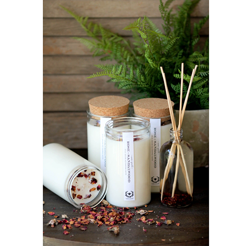 Stimulating rose and grounding sandalwood create a well balanced and sultry aroma. This candle is an aromatherapy blend of soy, beeswax, essential oils, artisan fragrance then finished with dried flowers and herbs.