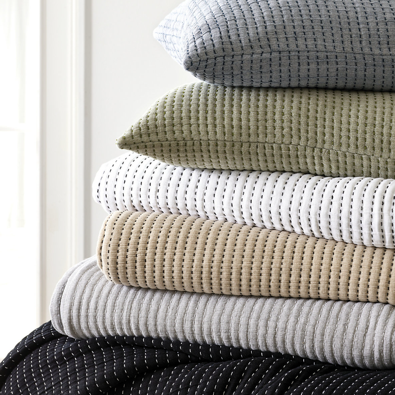 Precisely crafted pick-stitch accentuates the yarn dyed cotton jacquard of this reversible matelassé coverlet and matching sham. The double layer delivers lightweight warmth and a soft hand. Reverses to a solid back. Crafted by artisans committed to fair-labor practices.