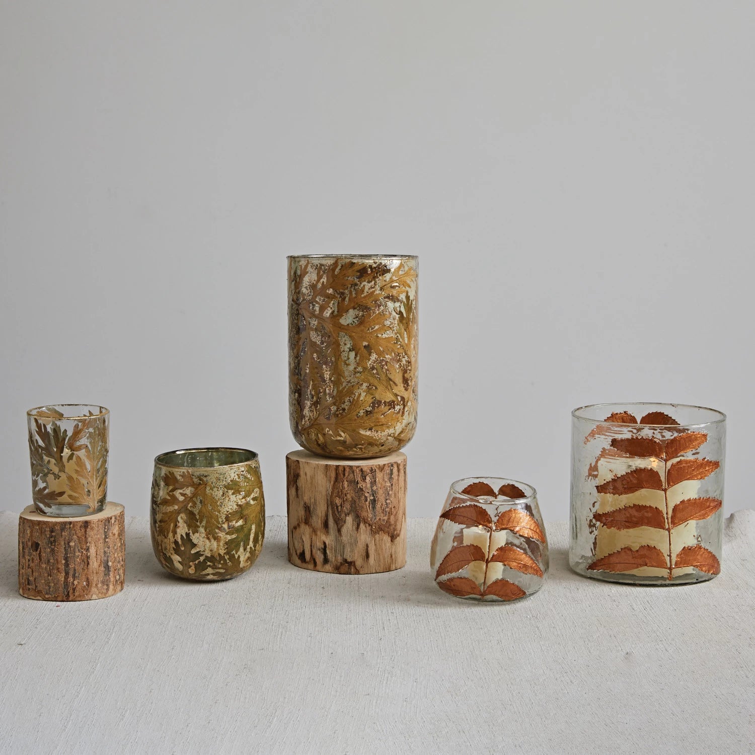 Add a touch of nature to your home with our 4" Tealight Holder! Made of glass, it features natural oak leaves embedded in the design and a gold rim for an elegant touch. Perfect for creating a warm and inviting ambience.