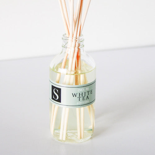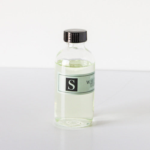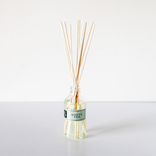 Our White Tea diffuser is a nurturing essence of herbal white tea leaves enhanced by exotic ginger and softened by a woodsy amber musk. Such a neutral and calming scent!