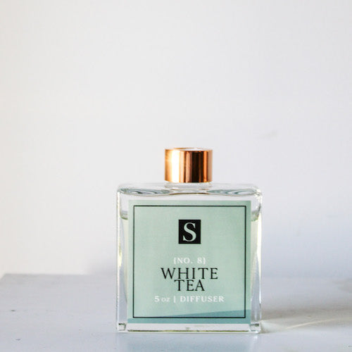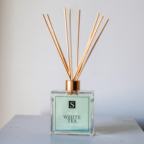 Our White Tea diffuser is a nurturing essence of herbal white tea leaves enhanced by exotic ginger and softened by a woodsy amber musk. Such a neutral and calming scent!