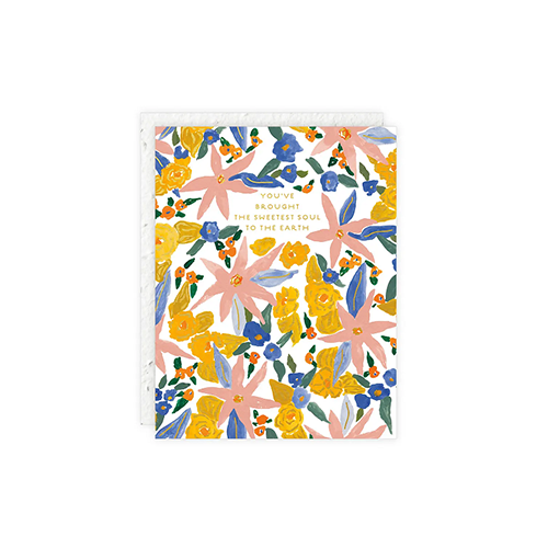 This floral card is the perfect way to welcome a new babe! Let your friends know they’ll be the best parents with this message that reads, "You've Brought the Sweetest Soul to the Earth." Beautiful and sustainable--this card also features a 100% plantable envelope embedded with wildflower seeds!