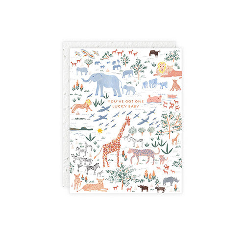 This adorable safari animal themed card is the perfect way to welcome a new babe! Let your friends know you think they’ll be the best parents with a card that reads “ You’ve Got One Lucky Baby.”