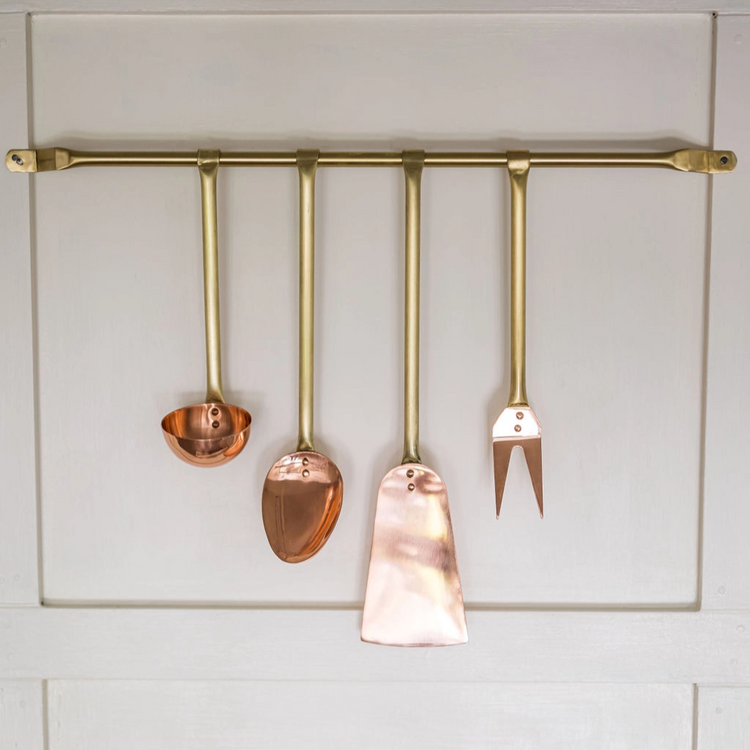 Made with 100% brass, our hanging utensil rod features two holes for easy installation. Showcase your beautiful brass utensils in style and declutter your kitchen counters today!