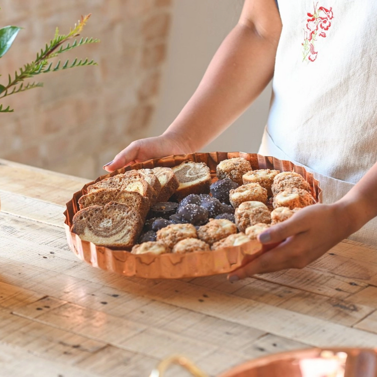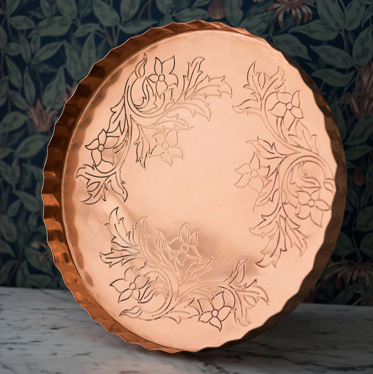 Add a touch of elegance to your home with our Copper Embossed Serving Tray! Made of 100% copper, this tray features a beautiful floral embossed pattern and a scalloped edge. Measuring 12" in diameter, it is perfect for serving a variety of treats, from cookies to cheese and crackers. Elevate your hosting game with this stunning tray!