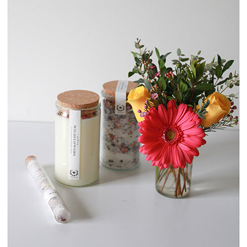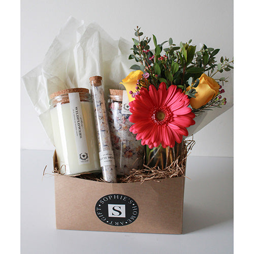 Surprise your loved ones with a Botanical flower Spa Gift Box! This beautifully curated box includes a Fresh Flower Arrangement in vase, Lemongrass or Rosewood Candle, and a Bath Soak to match. Indulge in the calming scents of wildflowers and elevate your self-care routine. Perfect for any occasion!