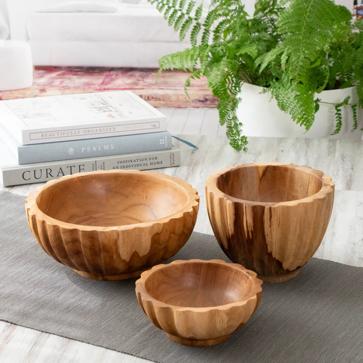 Carved in a beautiful scalloped edge pattern and made from gorgeous natural teak wood, our Scalloped Teakwood Medium Bowl is imported from Indonesia and is perfect for a variety of home decor uses, especially collecting all your odds and ends! There are slight variations from one to the next in colors and finish, which make these truly unique and one of a kind.