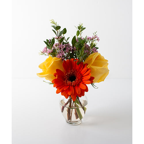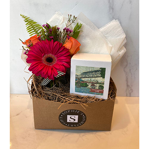 This Flower Gift Box+Signature Chattanooga is a forever favorite and a wonderful gift for Birthdays, Thank you, or Thinking of You gifts. This gift set includes a small vase of a colorful gerber daisy, 2 roses and a mix of filler greenery. This set also comes with one of our favorite signature candles. This candle...Chattanooga . The flowers and candle are presented in a box with tissue paper and a card. A perfect gift for many occasions!