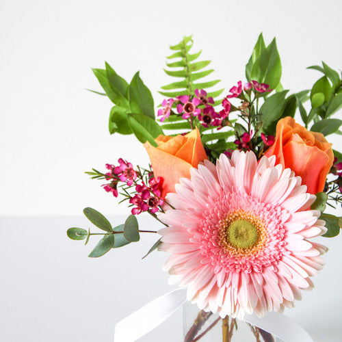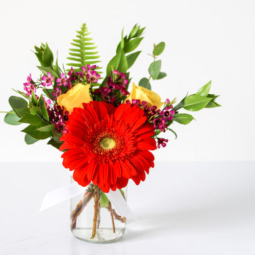 This Flower Gift Box + Signature Candle is a forever favorite and a wonderful gift for Birthdays, Thank you, or Thinking of You gifts. This gift set includes a small arrangement, featuring a colorful gerber daisy, 2 roses, and a mix of filler greenery. Also includes one of our Sophie's Signature candles! Pick from favorites like Napa, Cashmere, Orange Rind, and more. The flowers and candle are presented in a box with tissue paper and a handwritten card (include your message at checkout)! A perfect gift for many occasions...they'll love this sweet gift!