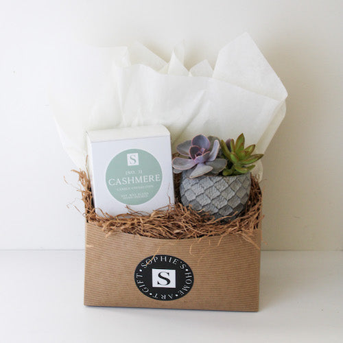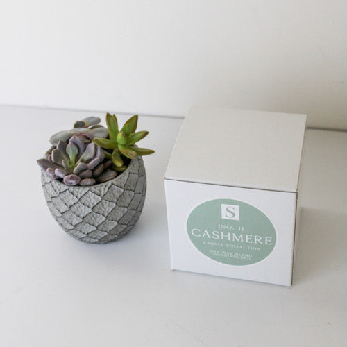 The Small Lattice + Cashmere Candle Gift Box is a beautiful combination for any occasion- Mother’s Day, housewarming, or birthday. The lattice-patterned, ceramic container is a matte grey with a mix of stunning succulents. The Cashmere candle boasts hints of clean linen and is a light and delightful scent.