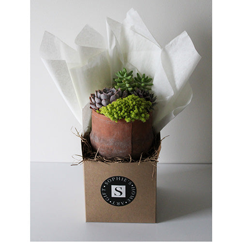 The Clay Potted Succulents feature a mix of assorted succulents in a rustic & fun terra cotta jar planter. These little guys are easy to take care of and make the perfect gift for a plant lover!
