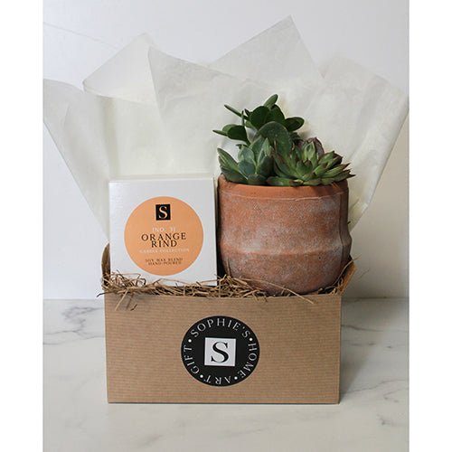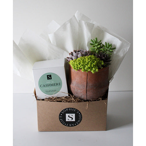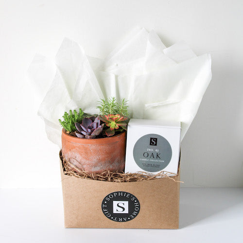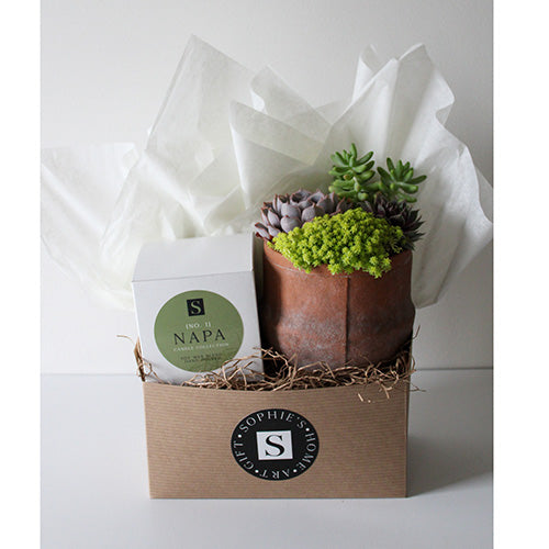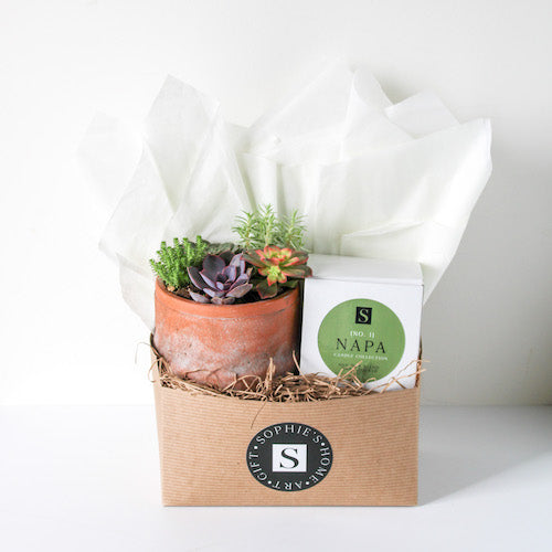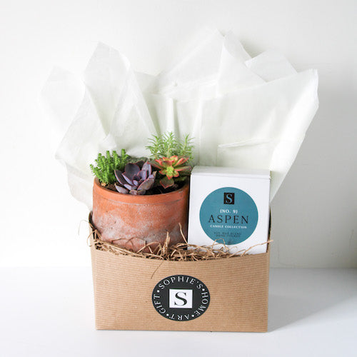 The Terra Jar Succulent + Signature Candle Gift Box makes such a sweet gift! This gift box features an assortment of succulents in a distressed terra cotta pot, along with one of our Sophie's Signature candles. Perfect gift for any occasion - birthdays, thank yous, "thinking of you," and more!