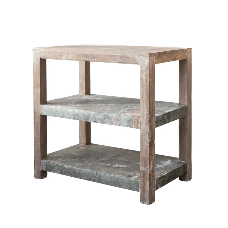 This Reclaimed Wood and Metal Clad Credenza captures the essence of rustic elegance. Standing at 34 inches high and stretching 35 inches wide, it offers two spacious shelves for storage or display. The natural finish of the wood, combined with the metal cladding, creates a piece that's not only visually appealing but also rich in history and texture.