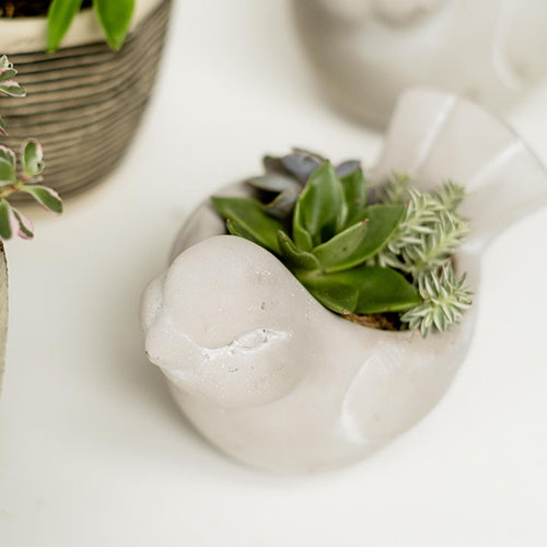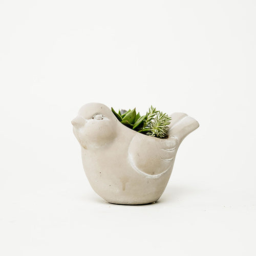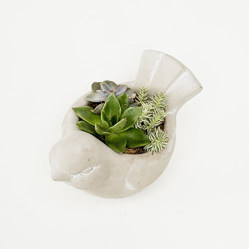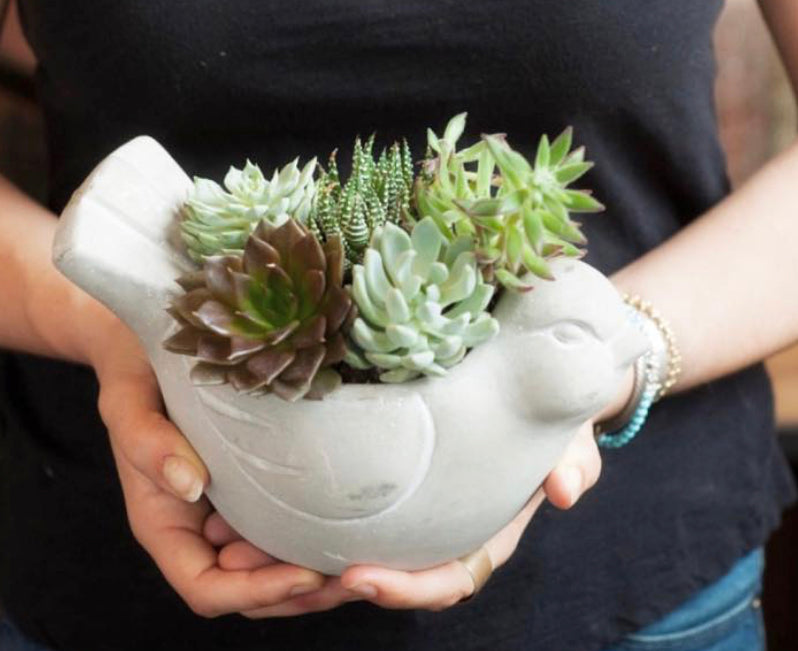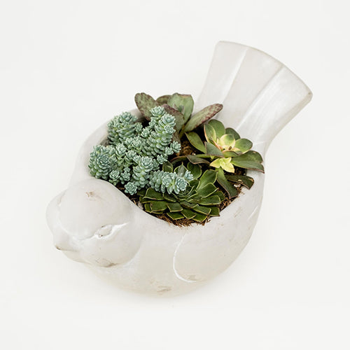 A favorite at the shop, this unique cement bird filled with a mix of succulents is a special gift. Very hardy and easy to take care of. This cement bird succulent would be great as a centerpiece, on a sideboard or end table. 2 sizes to choose from!